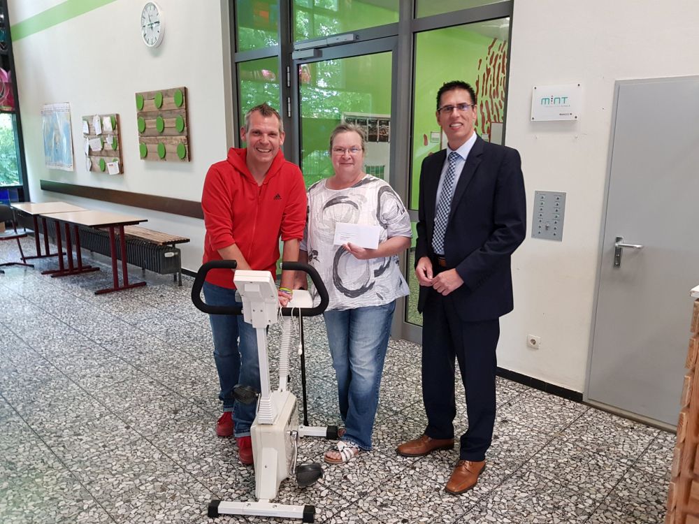 Während des Projektes „Herausforderung im 8. Jahrgang“ an der Profilschule Ascheberg (Zeitraum 13.-17.05) gab es ein Projekt im Projekt: auf einem Ergometer im Gebäude II der Profilschule sind durch die tatkräftige Unterstützung von Schülerinnen und Schüler sowie Lehrkräften 194 Kilometer geradelt worden.Im Vorfeld konnte Michael von Heesen (Team Schulsozialarbeit) die ortsansässige Sparkasse – in Persona von Herr Barrey – als Sponsor gewinnen. Herr Barrey hatte 1,-€/pro gefahrenen Kilometer in Aussicht gestellt. Die ohnehin großzügig angedachte Spende (bei 194 Kilometern wäre ein Betrag von 194,-€ zustande gekommen) wurde erfreulicherweise auf 200,-€ aufgerundet.